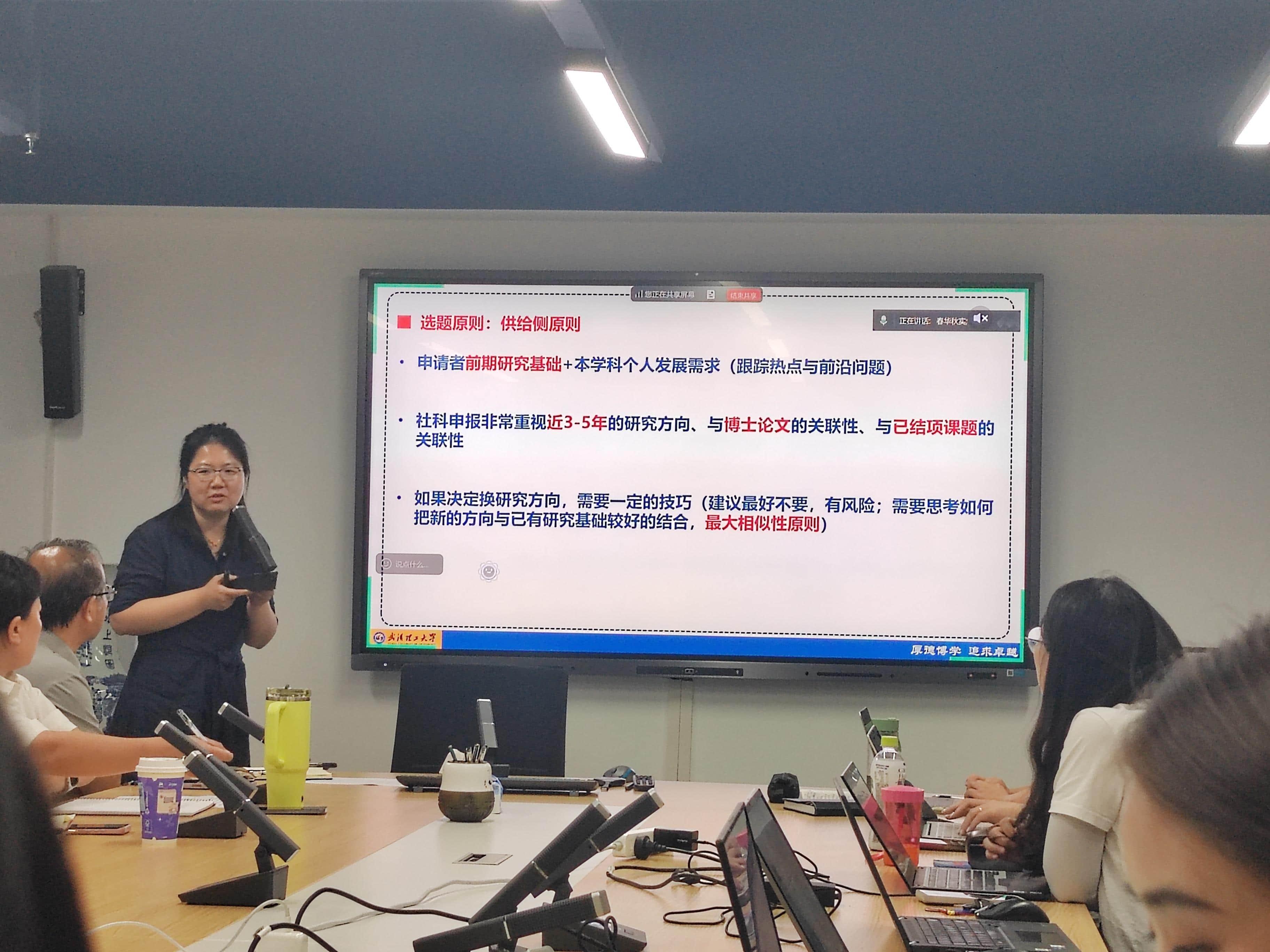 会议第二项,余珮教授、黄艳希副教授、费日龙老师分享了国家社科基金项目申报经验。余珮教授强调了选题的重要性,并分享了在撰写申请书和科研过程中的感悟。黄艳希副教授从“选题思路—面向国家重大战略需求”、“研究内容—课题论证的核心与关键”以及“材料支撑—创新点与研究基础关联性”三个方面,系统解析了申报书写作的要点。费日龙老师则从研究框架与申报流程出发,特别强调申报书的创新点必须显性化,使评审专家能够清晰理解研究的核心价值。