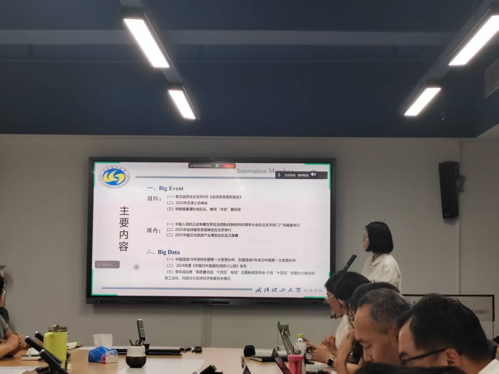 会议第三项,博士生魏鹏汇报了近期国内外重大事件与关键经济数据,为课题组掌握前沿动态提供了重要参考。随后,黄蕙萍老师勉励同学们勤于记录、善于思考,充分利用大组会平台加强学术交流。