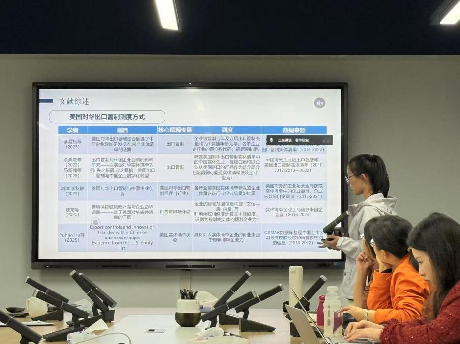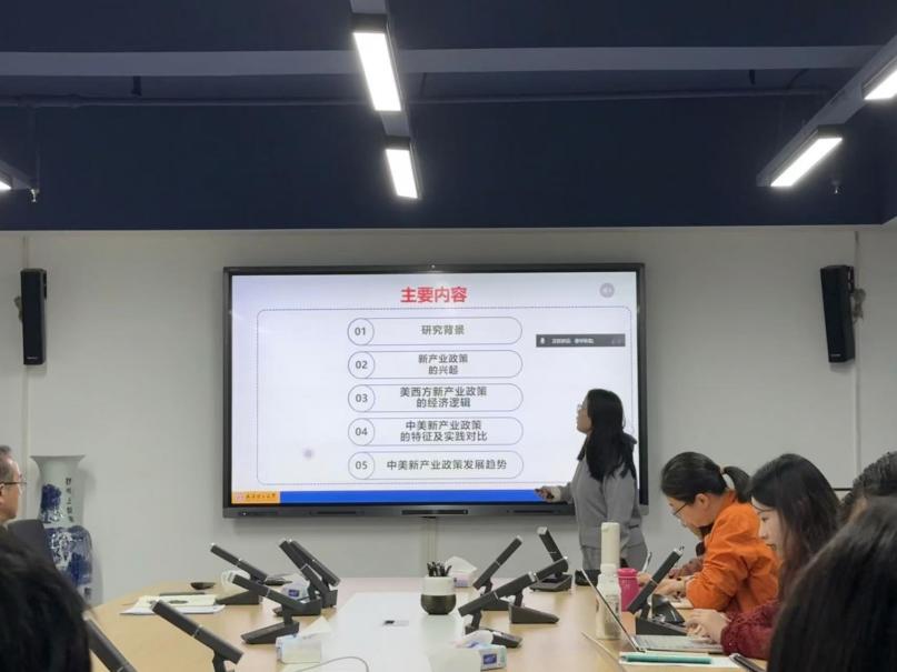 会议第二项,博士生刘莹和硕士生曹紫嫣分别作论文汇报。首先,博士生刘莹以《新产业政策经济逻辑及中美实践对比》为题,从研究背景、新产业政策兴起、美西方新产业政策的经济逻辑、中美新产业政策的特征及实践对比、中美新产业政策发展趋势等五个方面进行汇报。魏龙教授建议进一步聚焦政策传导机制及政策效果评估,并鼓励同学们通过参与组会汇报不断完善选题与研究设计。硕士生曹紫嫣梳理了美国对华出口管制的主要特征及经济影响,并提炼出现有研究不足和未来拓展方向。魏龙老师进一步补充了美国对华出口管制的方式,并建议同学们通过梳理文献思考选题。
