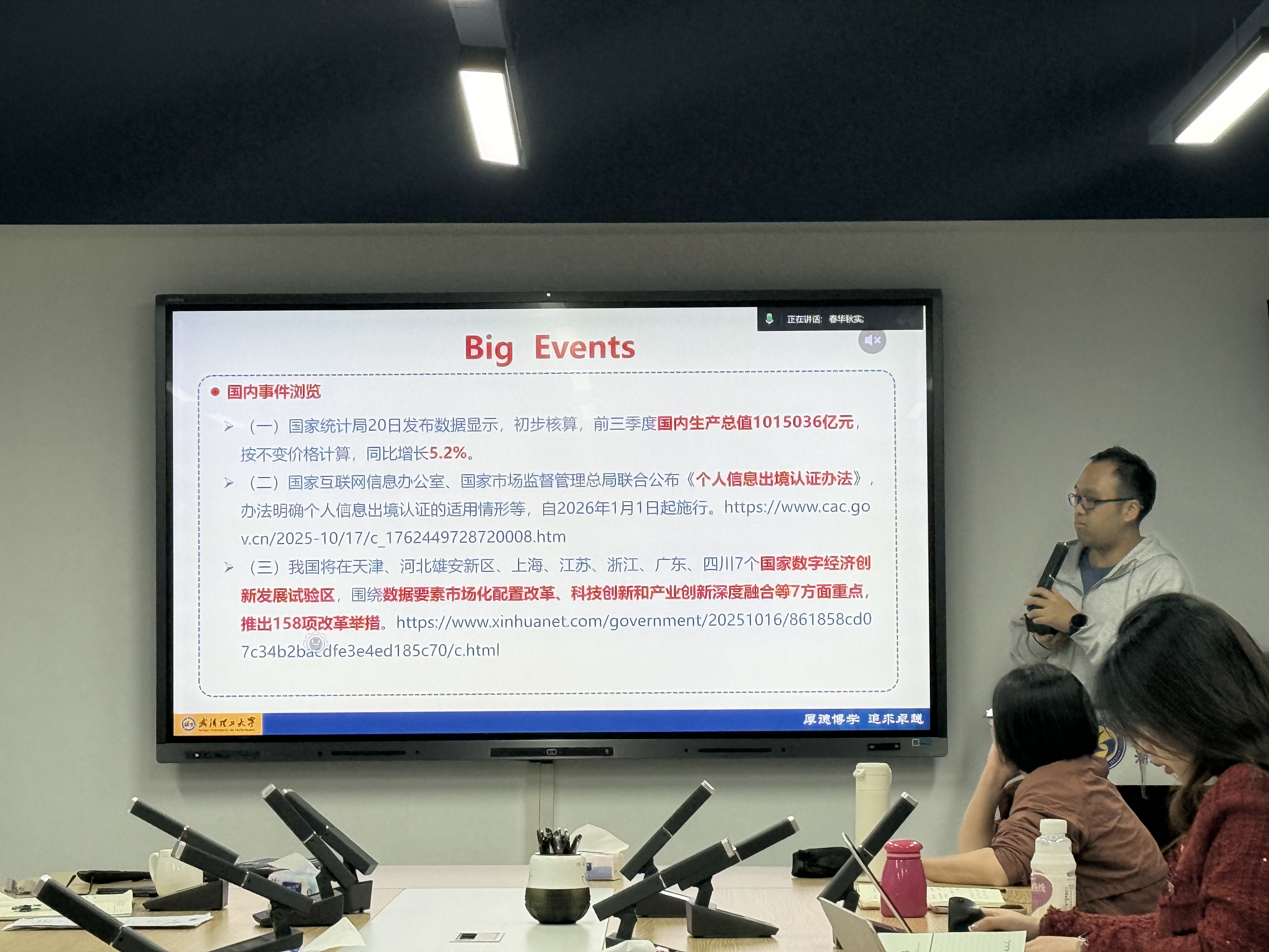 会议第三项,博士生黄轩分享了近期国内外重大事件。黄轩重点介绍了党的十四届四中全会相关政策议题,为同学们了解最新的政策动态、拓展研究视角提供了有益参考。