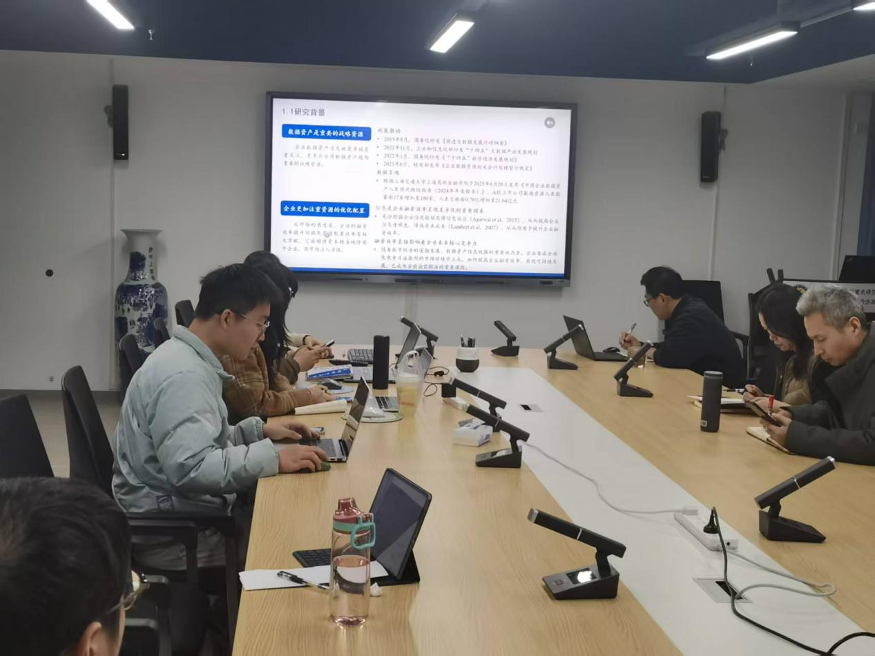 首先,黄曦涵同学进行了题为《数据资产信息披露对企业融资效率的影响研究》的硕士论文进展汇报。该研究聚焦数字经济背景下的数据资产价值转化,以2014-2024年深A股上市企业为样本,通过文本分析、实证检验等方法,探究数据资产信息披露对企业融资效率的影响机制。研究发现,该披露行为可通过信息治理、减轻融资负担、优化资金配置三条路径提升企业融资效率,且在机构持股比例高、数字经济发达的东部地区及数字型企业中,这一效应更为显著。随后,师生们围绕论文内容开展讨论。谷军健老师和刘春晖老师认为需要调整融资效率测度指标,明确筹资费用与用资成本的核算逻辑,强化“投入-产出”对应关系;韩书成老师强调规范案例设计需聚焦披露行为本身,选取传统企业数字化转型典型案例并补充三年以上趋势图表;汪芳教授则指出要厘清数据资源、数据资产、数据资本等核心概念边界,避免混淆。