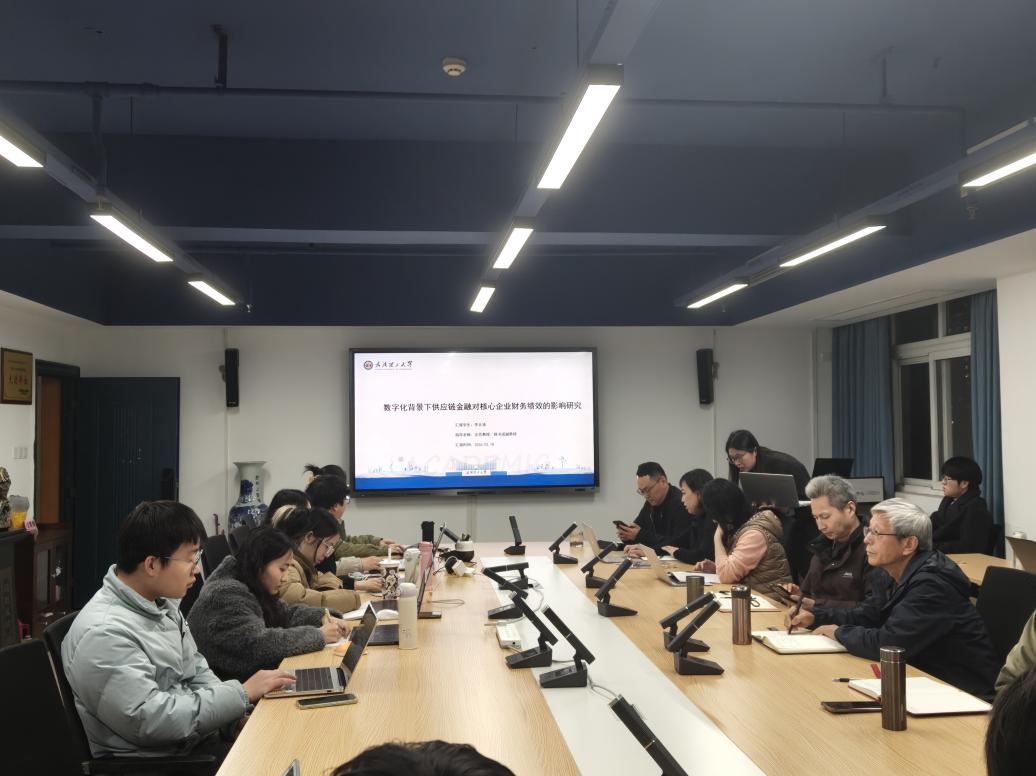随后,李北清同学进行了题为《数字化背景下供应链金融对核心企业财务绩效的影响研究》的论文汇报,围绕供应链金融发展现状、作用路径,及其对核心企业财务绩效的具体影响展开详细阐述。针对该研究,赵玉林教授与黄蕙萍教授共同提出,供应链金融研究需重点纳入供应商相关维度,供应商的信誉等级、技术水平等因素,均会对核心企业最终的财务绩效产生重要影响。