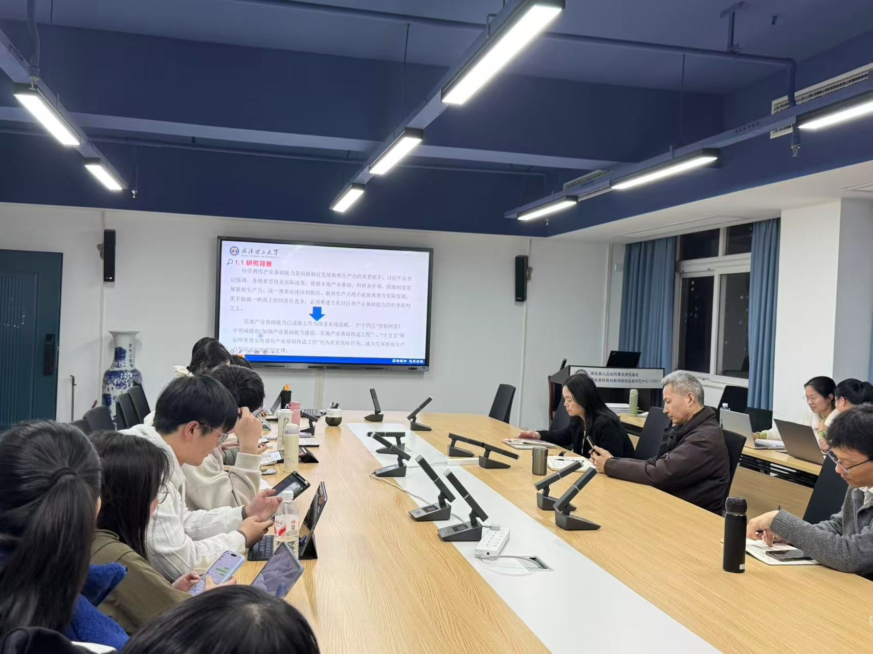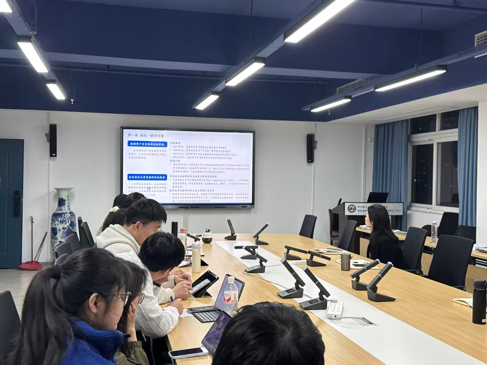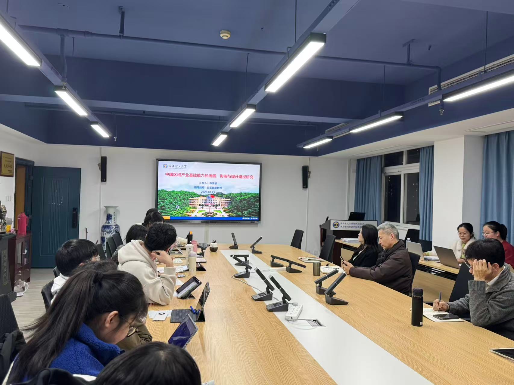 随后,陈美辰同学进行了题为《中国区域产业基础能力的测度、影响与提升路径研究》的论文汇报,立足国内产业基础存在短板、新质生产力加速培育的现实背景,聚焦产业基础能力测度、影响路径及赋能效应展开深入研究。参会师生现场交流研讨、提出完善建议。汪芳教授指出需明确产业基础能力强弱的核心意义与实际作用,同时优化产业相关论述,贴合研究主题。