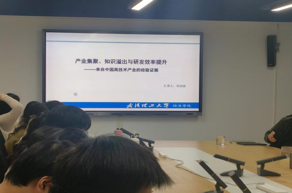 首先,胡成丽同学围绕《产业集聚、知识溢出与研发效率提升——来自中国高技术产业的经验证据》展开论文汇报,汇报立足我国高技术产业研发创新面临的内外困境与产业集聚现状,从区域、企业、产业三个层面系统梳理相关文献,发现现有研究在研发细分阶段划分及吸收能力调节作用的探讨上存在不足。在此基础上,她从专业化集聚与多样化集聚两条路径,深入分析其对研发效率的作用机制,并提出吸收能力在其中发挥中介作用,旨在为破解高技术产业研发低效难题、推动创新提质与科技自立自强提供理论依据与经验支撑。汇报结束后,在场师生围绕论文内容展开深入研讨,并提出了宝贵的修改意见。周新荃老师就知识创新是否区分显性与隐性提出疑问;刘春晖老师指出,数字经济时代与工业经济时代背景存在显著差异,我国高技术产业的定义与发展现状也应结合时代特征重新审视,并就数字经济背景下高技术产业的发展路径发起讨论;韩书成老师则建议,论文在语言表述与逻辑梳理方面仍需进一步打磨完善。