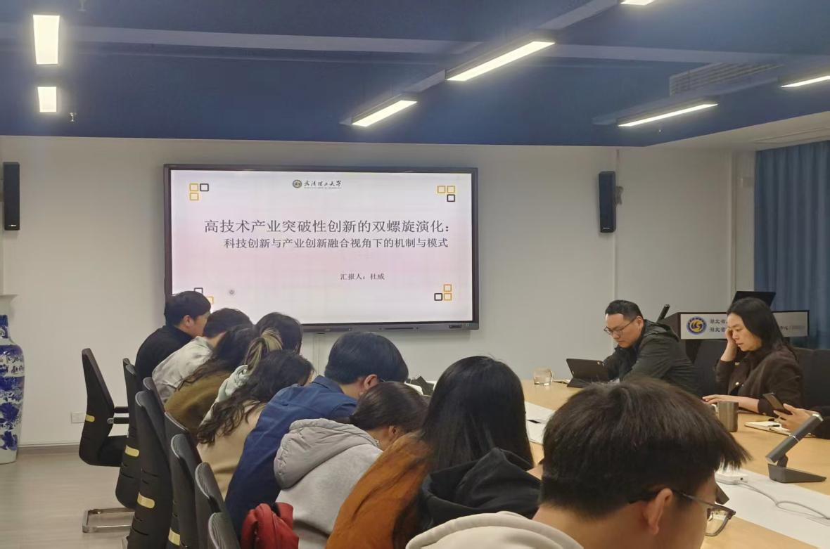 最后,杜威同学围绕《高技术产业突破性创新的双螺旋演化:科技创新与产业创新融合视角下的机制与模式》《AI产业突破性创新演化的过程机制研究——基于科技创新与产业创新融合设计》两篇论文进行汇报,从研究方法、研究结果、研究结论三个维度展开详细阐述,从基础研究、知识转化、应用推广三个阶段提炼研究启示,同时分别从科技创新与产业创新深度融合、企业智能化转型两个方面进行理论分析,最后将AI的演化路径分为工具化、产品化、要素化三个阶段,逐一展开详细讲解。汇报结束后,师生们再次展开热烈研讨并提出针对性建议。韩书成老师就过程机制中科技创新与产业创新的融合路径提出疑问;刘春晖老师强调,AI产业是AI技术与实体经济深度融合的产物,核心在于技术与产业的融合应用,而非单纯的AI技术本身;赵玉林教授则建议,在阶段总结部分应采用统一的分析框架,提升研究的系统性与严谨性。