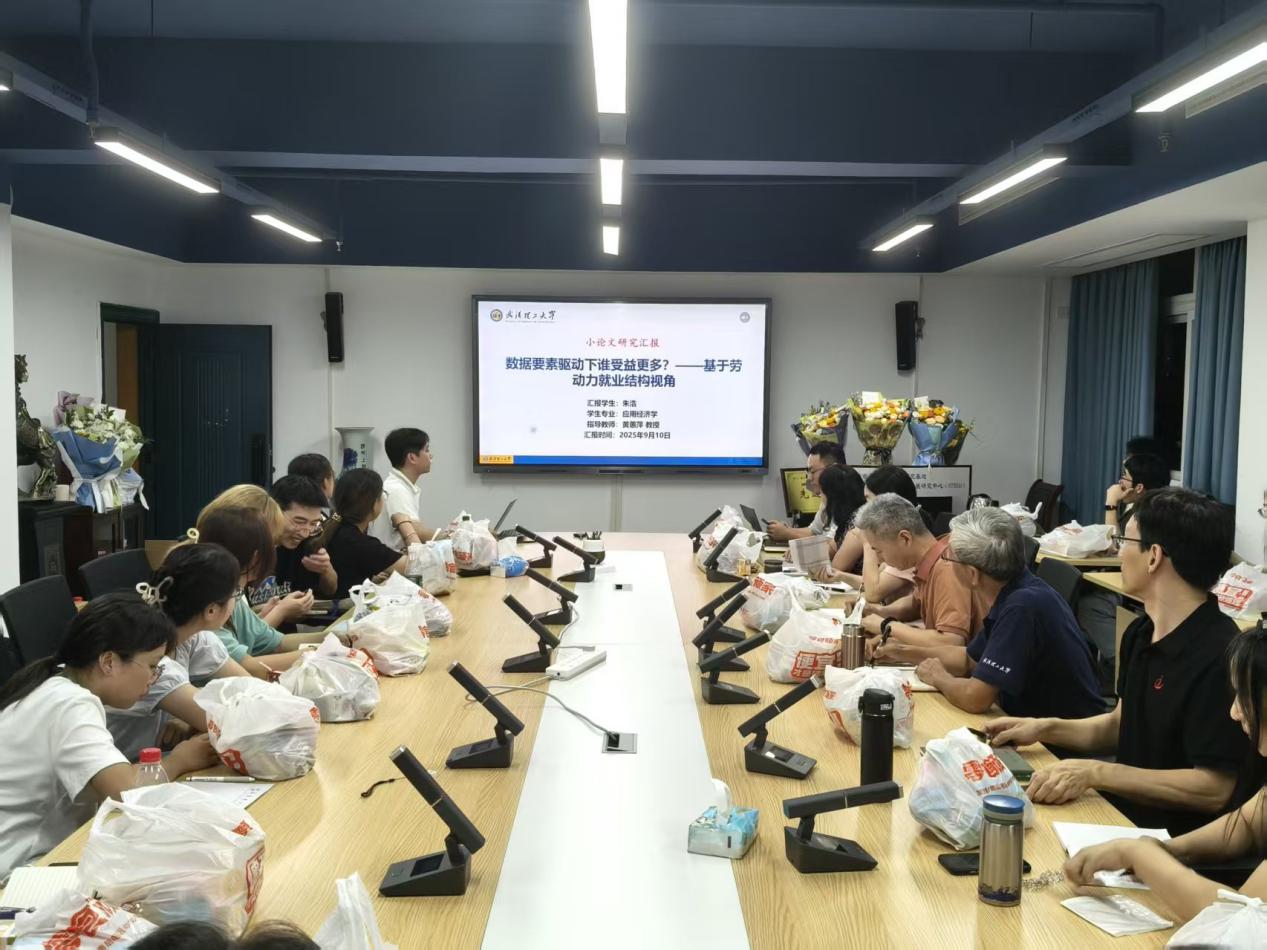 会议下半场,朱浩同学作了题为《数据要素驱动下谁受益更多?——基于劳动力就业视角》的工作论文汇报。论文探讨数据要素对劳动力就业的影响,发现就业红利在不同群体间存在差异。汇报后,师生展开深入讨论。谷军健老师建议在回归中加入省份固定效应并深化模型理解;黄蕙萍教授与汪芳教授提醒要保证题目与内容高度契合;刘春晖老师指出异质性分析需注意户籍地与就业地差异可能带来的数据偏差;赵玉林教授强调应进一步探究数据要素对不同群体差异化影响的机制路径。