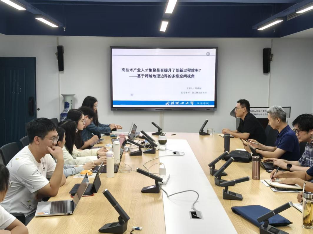 首先,胡成丽同学汇报了题为《高技术产业人才集聚是否提升了创新过程效率?——基于跨越地理边界的多维空间视角》的研究进展。论文基于创新价值链框架,将创新过程划分为知识生产、物化产出和价值创造三个阶段,考察不同主体人才集聚对“本地—邻地”产业创新效率的影响。与会师生围绕人才类型界定及结论合理性展开深入讨论。韩书成老师建议在价值实现阶段进一步说明所需人才层次,并提出人才测算的方法;赵玉林教授指出需解释空间相关性分析中部分年份数值的异常变化,同时探讨数字经济与知识经济语境下结论差异;刘春晖老师提醒应厘清人才投入与创新之间的关系。