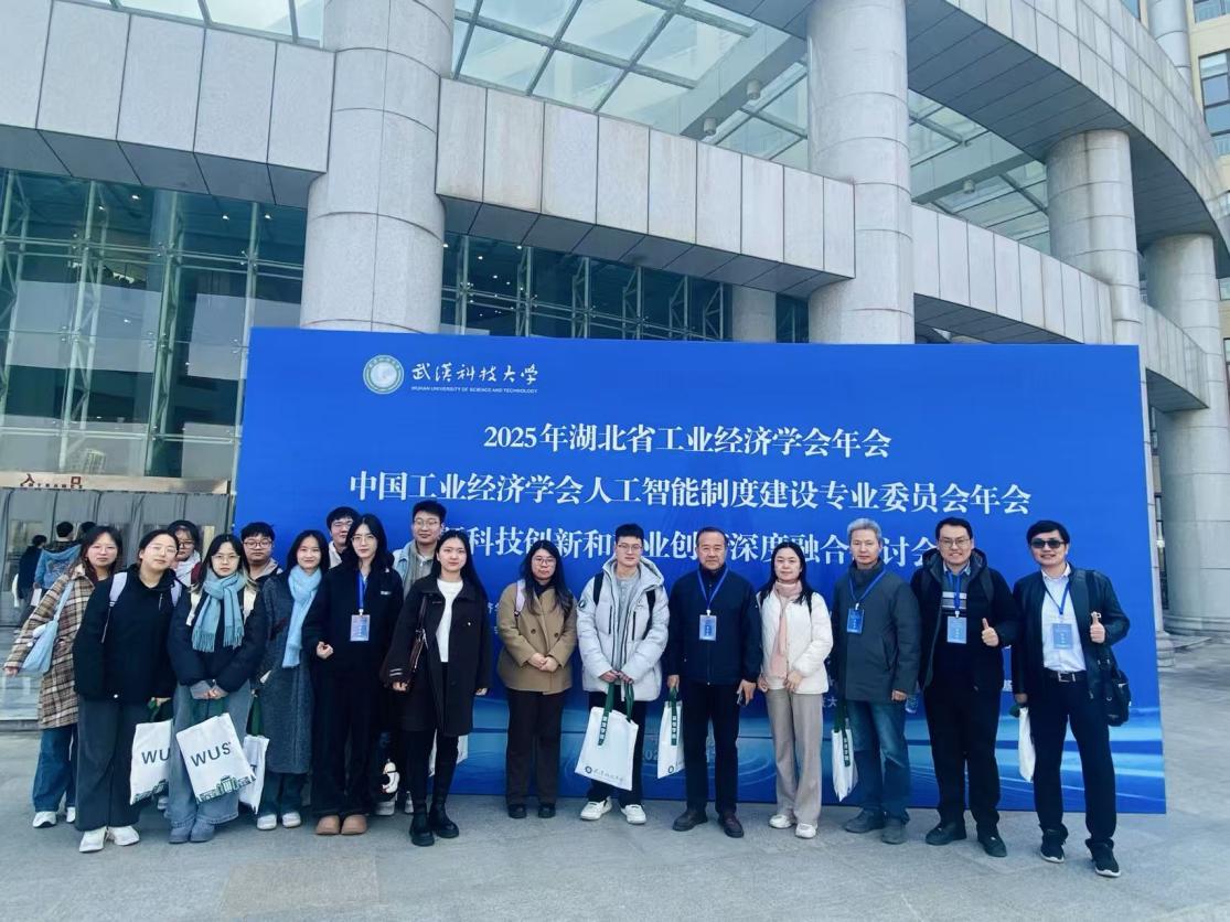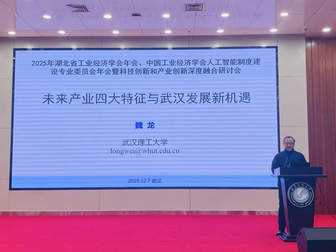 12月7日,2025年湖北省工业经济学会年会、中国工业经济学会人工智能制度建设专业委员会年会暨“科技创新和产业创新深度融合研讨会在武汉科技大学黄家湖校区顺利进行。武汉理工大学科技创新与经济发展研究中心主任、湖北省工业经济学会副会长魏龙教授带队参加会议并做主旨报告。本次会议还邀请了中国社会科学院工业经济研究所原所长史丹教授、复旦大学经济学院副院长寇宗来教授、东北财经大学于左教授作为演讲嘉宾出席。省内各高校的专家学者、学生约100人参加此次学术年会。研究中心部分教师、研究生到会交流学习。